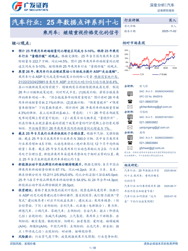 【广发证券】【202511】汽车行业:25年数据点评系列十七:乘用车:继续重视价格变化的信号-33页 证券期货研究报告