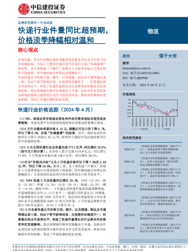 【中信建投证券】【20240421】物流行业:快递行业件量同比超预期,价格淡季降幅相对温和-19页 行业研究