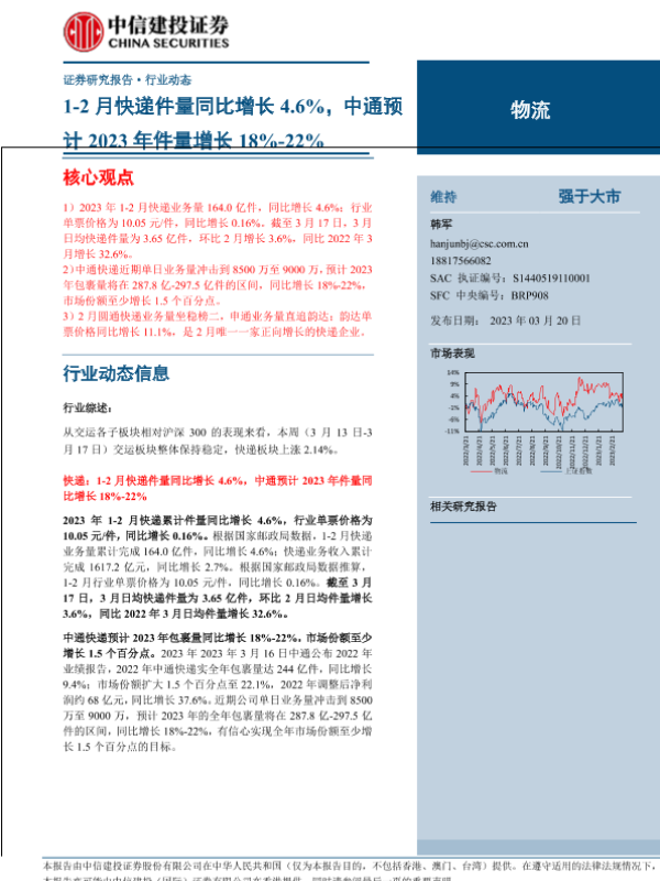 【中信建投证券】【20230320】物流行业:1_2月快递件量同比增长4.6%,中通预计2023年件量增长18%_22%-24页 行业研究