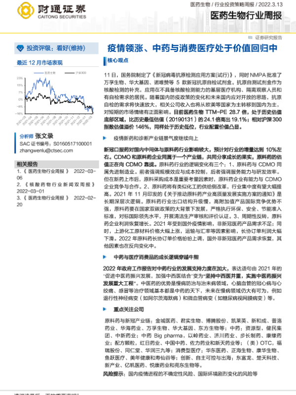 【财通证券】【20220313】医药生物行业周报:疫情领涨、中药与消费医疗处于价值回归中-11页 行业研究
