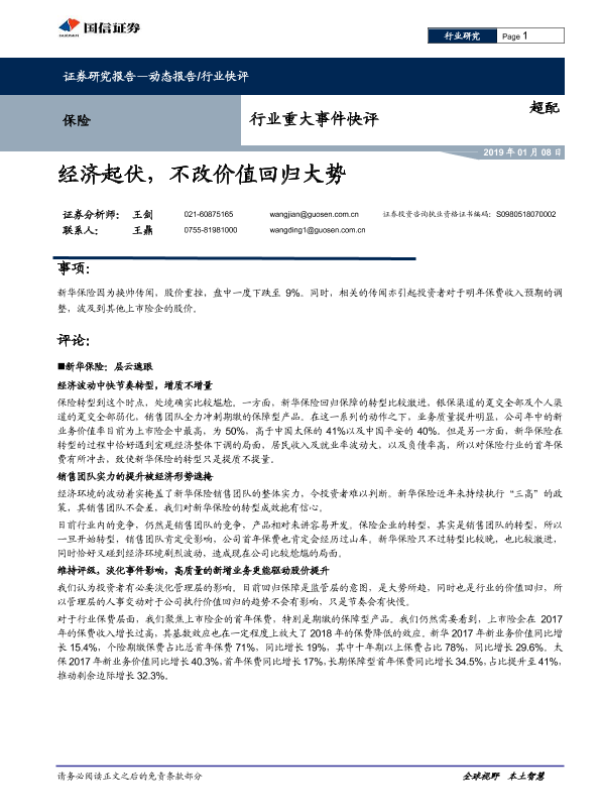 【国信证券】【20190108】保险行业重大事件快评:经济起伏,不改价值回归大势-4页 行业研究