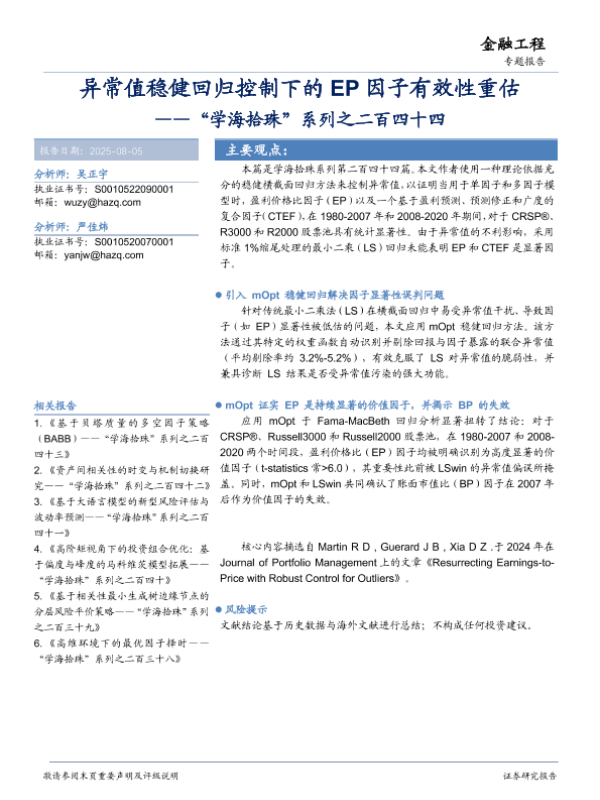 【华安证券】【202508】异常值稳健回归控制下的EP因子有效性重估-20页 证券期货研究报告