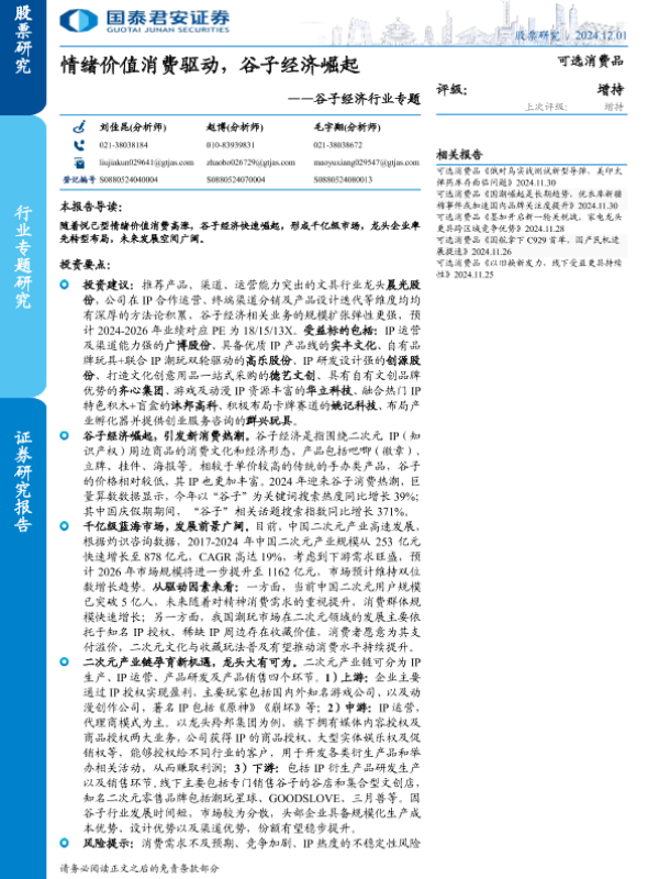 【国泰君安证券】【20241201】谷子经济行业专题:情绪价值消费驱动,谷子经济崛起-29页 行业研究