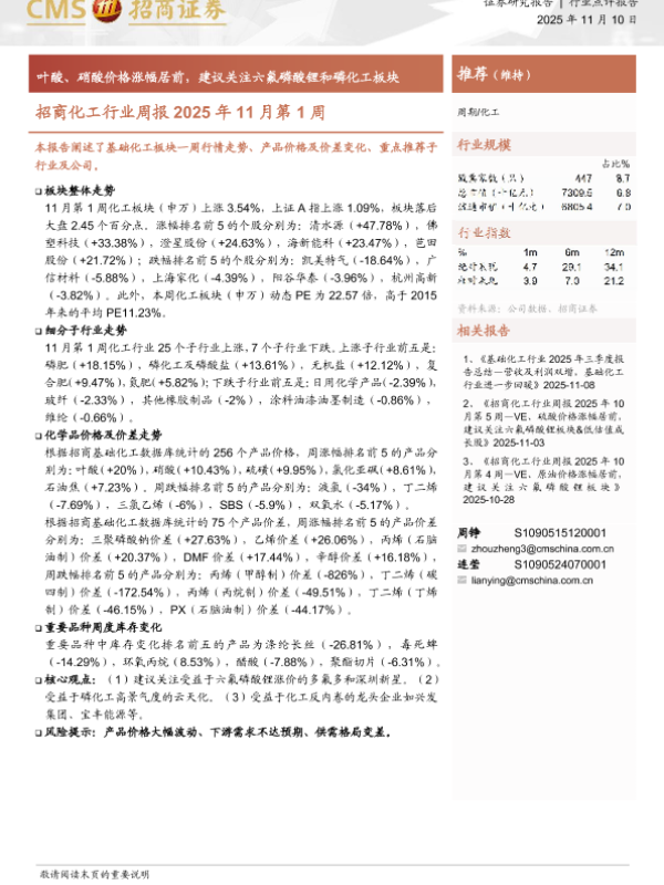 【海通证券】【202510】招商证券-化工行业周报2025年10月第4周:VE、原油价格涨幅居前,建议关注六氟磷酸锂板块-16页 证券期货研究报告