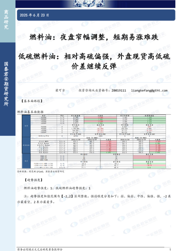 【国泰君安期货】【20250623】燃料油:夜盘窄幅调整,短期易涨难跌-2页 证券期货研究报告