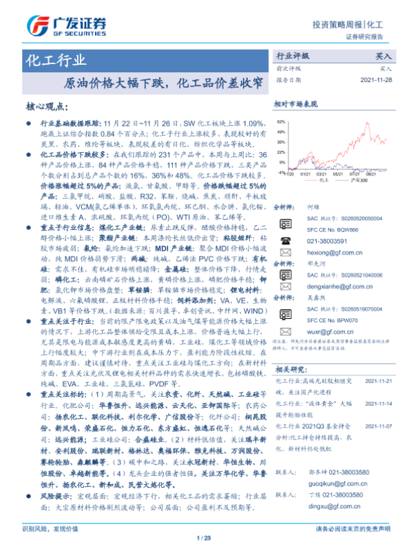 【广发证券】【20211128】20211128-广发证券-化工行业:原油价格大幅下跌,化工品价差收窄-23页 行业研究