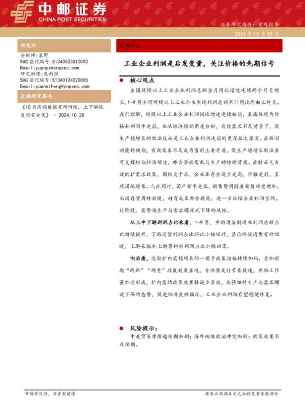【中邮证券】【20241028】宏观研究:工业企业利润是后发变量,关注价格的先期信号-10页 宏观策略