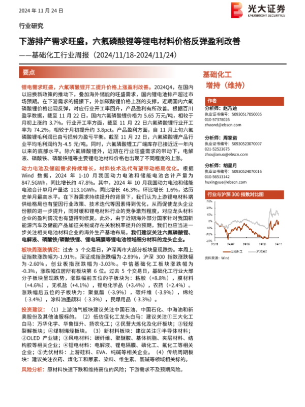 【光大证券】【20241124】基础化工行业周报:下游排产需求旺盛,六氟磷酸锂等锂电材料价格反弹盈利改善-21页 行业研究