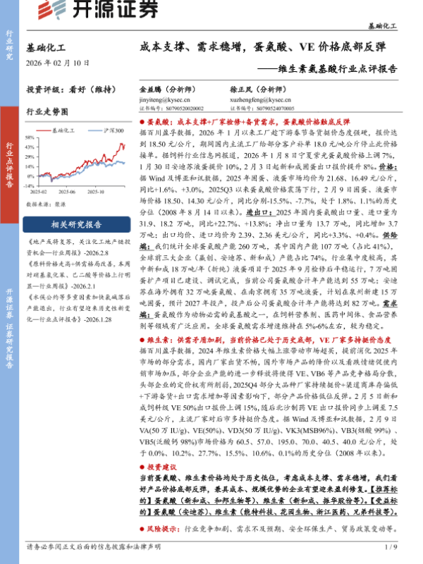 【开源证券】【202602】基础化工 | 成本支撑、需求稳增,蛋氨酸、VE价格底部反弹——维生素氨基酸行业点评报告-9页 证券期货研究报告