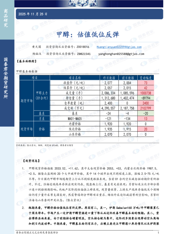 【国泰君安期货】【202511】多甲醇:估值低位反弹-3页 证券期货研究报告