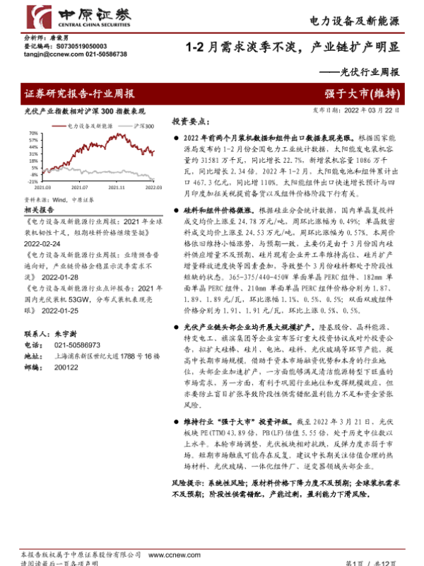 【中原证券】【20220322】光伏行业周报:1-2月需求淡季不淡,产业链扩产明显-12页 行业研究