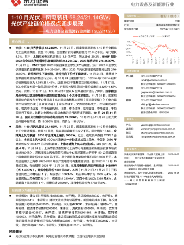 【东方证券】【20221130】电力设备及新能源行业周报:1-10月光伏、风电装机58.24 21.14GW,光伏产业链价格拐点逐步展现-12页 行业研究