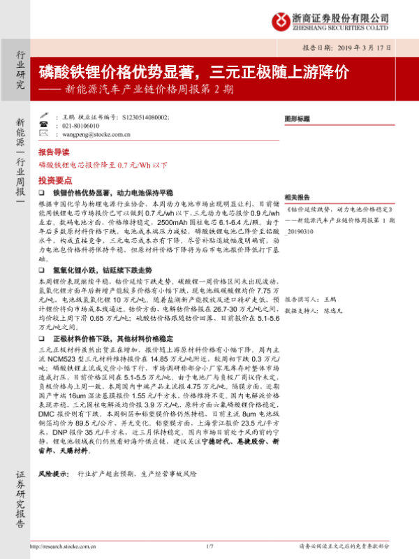 【浙商证券】【20190317】20190317-浙商证券-新能源汽车产业链价格周报第2期:磷酸铁锂价格优势显著,三元正极随上游降价-7页 行业研究