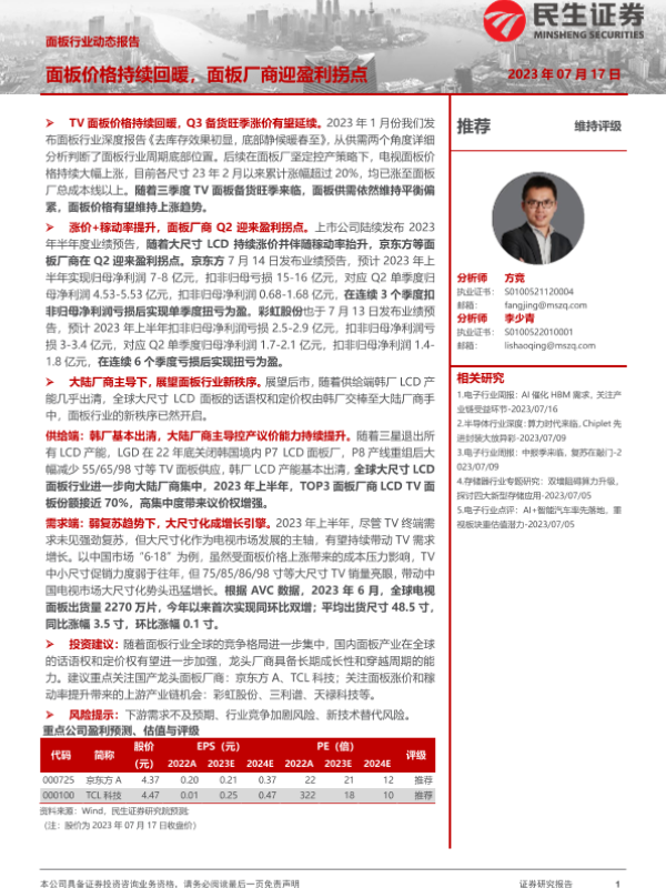 【民生证券】【20230717】面板行业动态报告:面板价格持续回暖,面板厂商迎盈利拐点-12页 行业研究