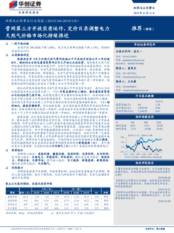 【华创证券】【20191111】环保及公用事业行业周报:管网第三方开放实质运作,定价目录调整电力天然气价格市场化持续推进-29页 行业研究