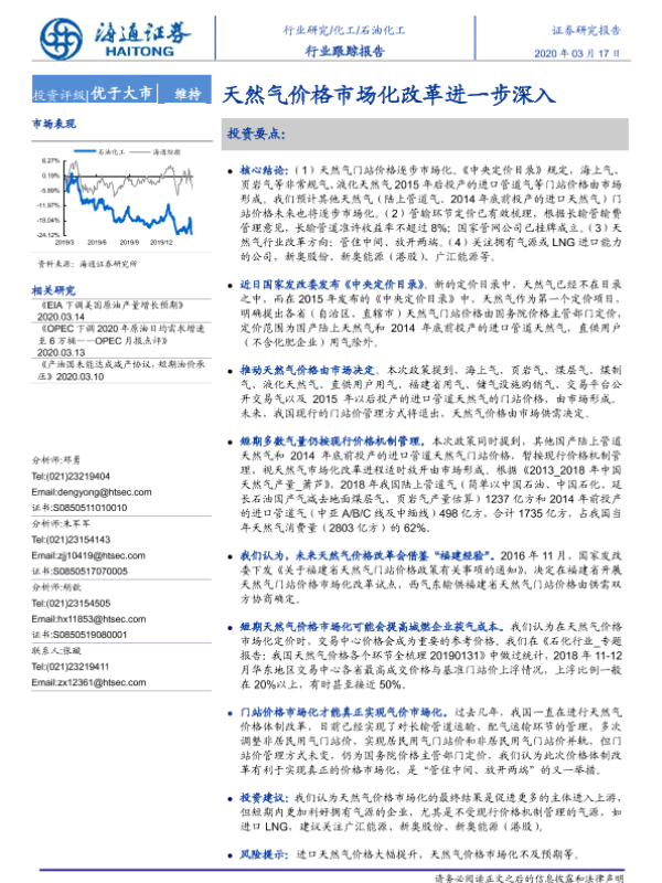 【海通证券】【20200317】石油化工行业跟踪报告:天然气价格市场化改革进一步深入-2页 行业研究