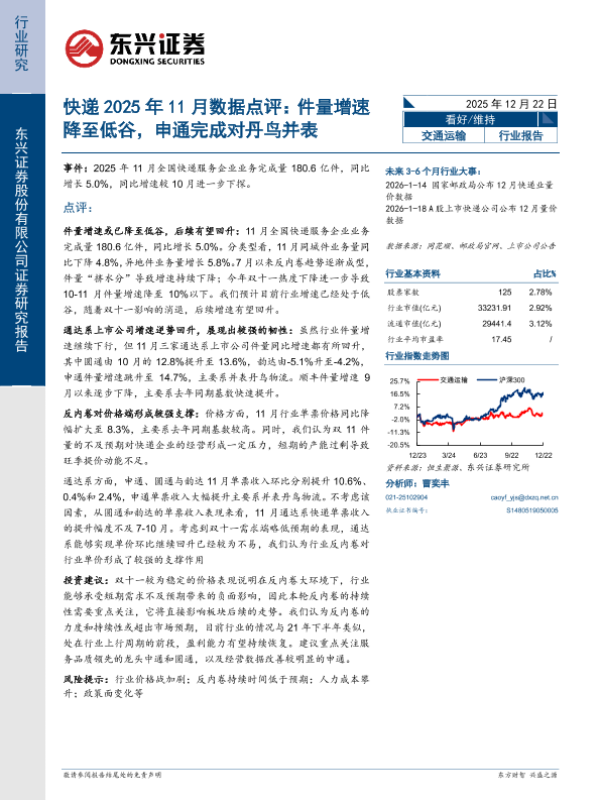 【东兴证券】【202512】快递2025年11月数据点评:件量增速降至低谷,申通完成对丹鸟并表-9页 证券期货研究报告