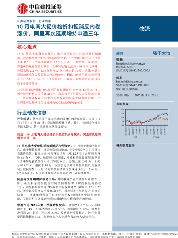 【中信建投证券】【202511】物流行业:10月电商大促价格折扣抵消反内卷涨价,阿里再次延期增持申通三年-17页 证券期货研究报告
