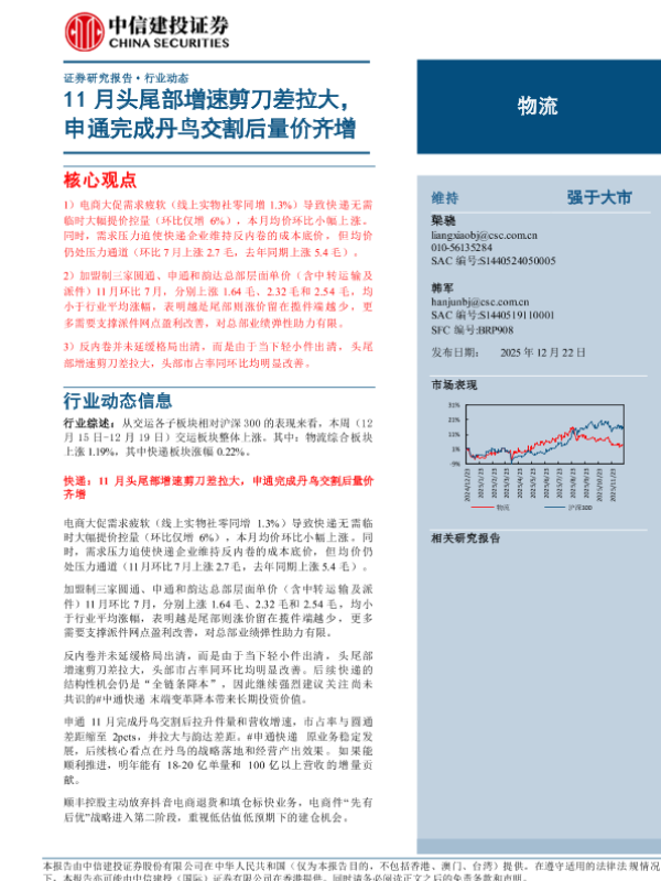 【中信建投证券】【202512】物流行业:11月头尾部增速剪刀差拉大,申通完成丹鸟交割后量价齐增-16页 证券期货研究报告