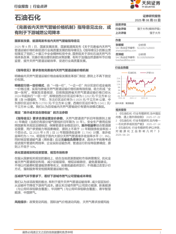 【天风证券】【20250803】完善省内天然气管输价格机制_指导意见出台_或有利于下游城燃公司降本-2页 行业研究