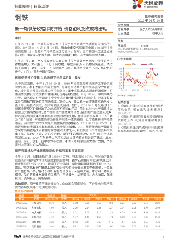【天风证券】【20190624】20190624-天风证券-钢铁行业点评:新一轮供给收缩即将开始 价格盈利拐点或将出现-2页 行业研究