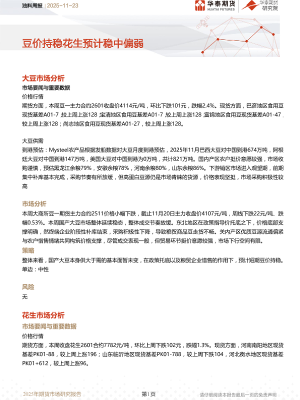 【华泰期货】【202511】油料周报 | 豆价持稳花生预计稳中偏弱-9页 证券期货研究报告