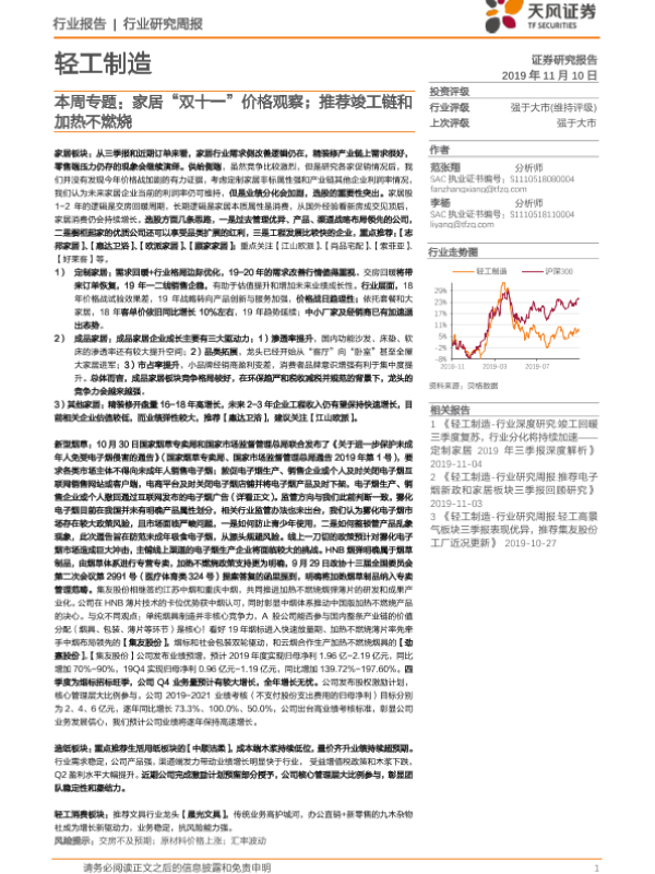 【天风证券】【20191110】轻工制造本周专题:家居“双十一”价格观察;推荐竣工链和加热不燃烧-27页 行业研究
