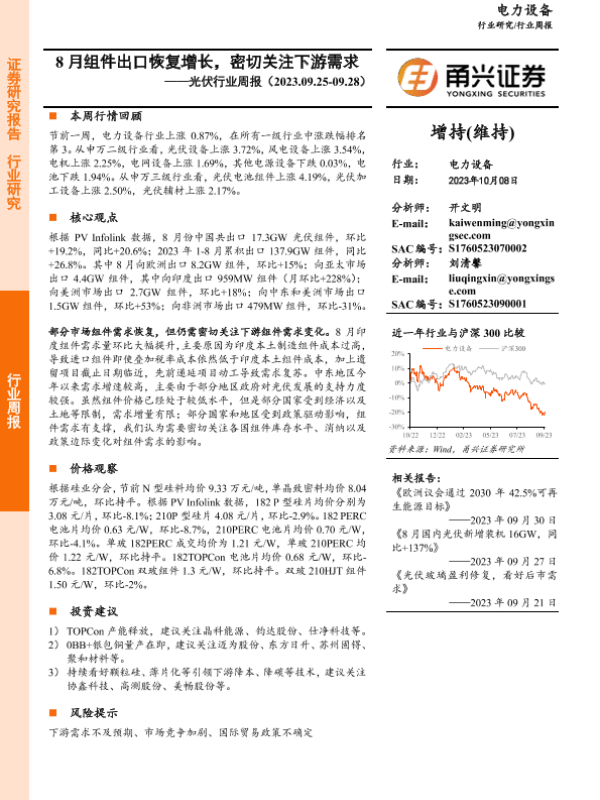 【甬兴证券】【20231008】8月组件出口恢复增长,密切关注下游需求——光伏行业周报(2023.09.25-09.28)-15页 行业研究