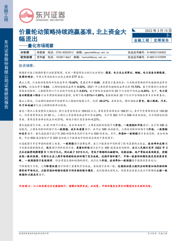 【东兴证券】【20220313】量化市场观察:价量轮动策略持续跑赢基准,北上资金大幅流出-20页 行业研究