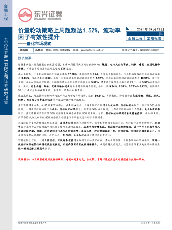 【东兴证券】【20210912】量化市场观察:价量轮动策略上周超额达1.52%,波动率因子有效性提升-17页 行业研究