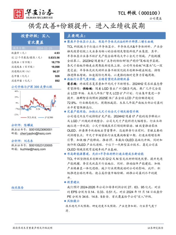 【华安证券】【20241115】20241115-华安证券-TCL科技-000100.SZ-供需改善+份额提升,进入业绩收获期-31页 行业研究