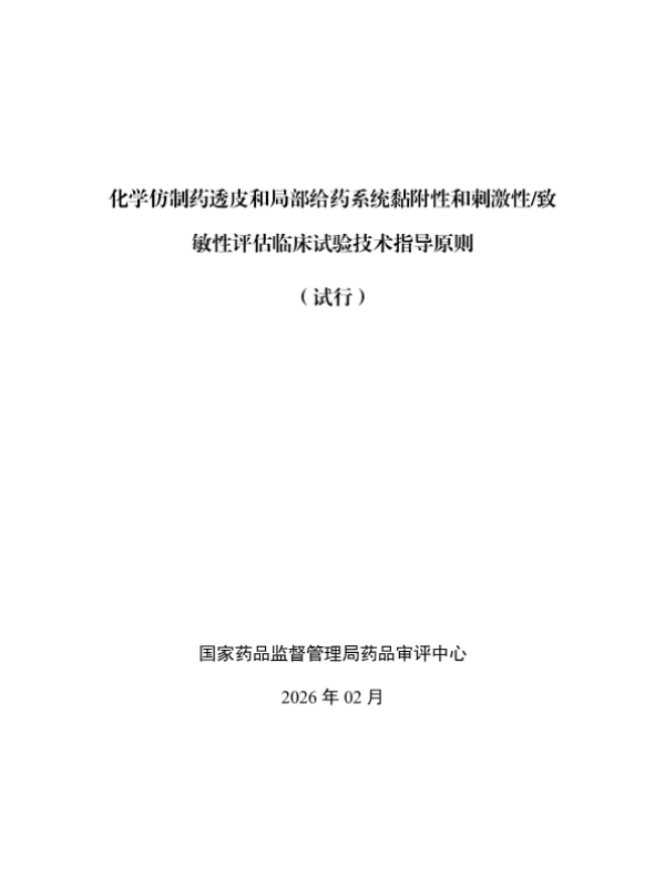 【国家药品监督管理局药品审评中心】【202602】化学仿制药透皮和局部给药系统黏附性和刺激性/致敏性评估临床试验技术指导原则(试行)-18页 指南