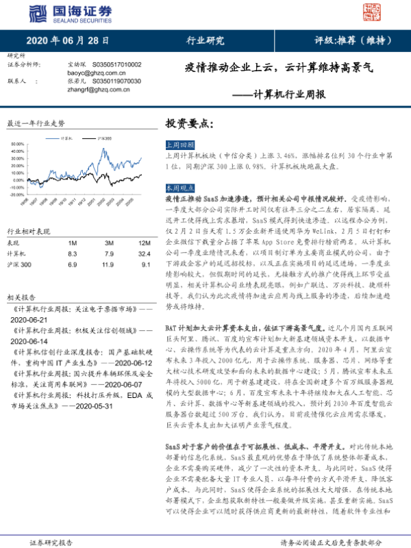 【国海证券】【20200628】计算机行业周报:疫情推动企业上云,云计算维持高景气-12页 行业研究