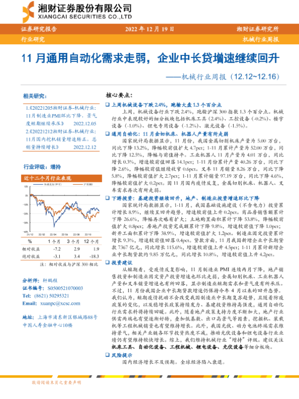 【湘财证券】【20221219】11月通用自动化需求走弱,企业中长贷增速继续回升-12页 行业研究