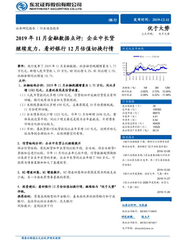 【东北证券】【20191211】2019年11月金融数据点评:企业中长贷继续发力,看好银行12月估值切换行情-5页 行业研究
