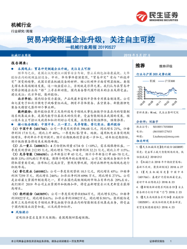 【民生证券】【20190527】机械行业周报:贸易冲突倒逼企业升级,关注自主可控-18页 行业研究