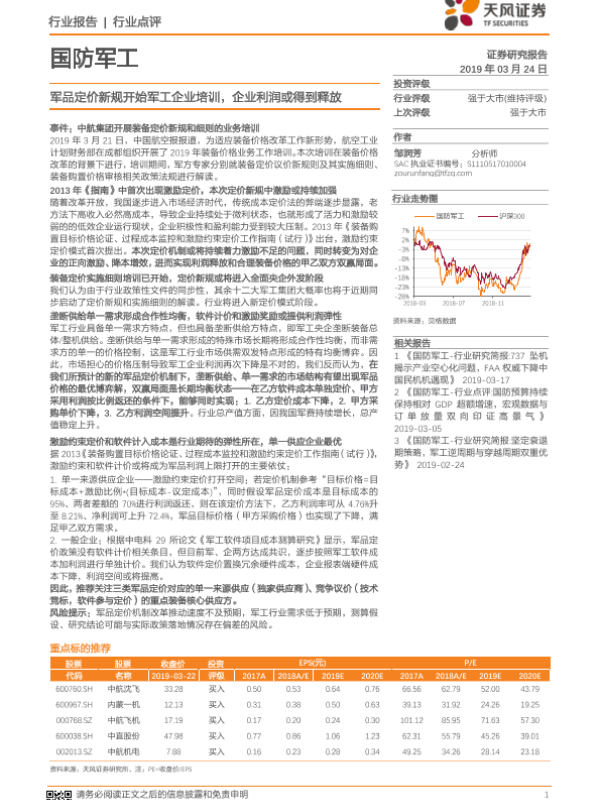 【天风证券】【20190324】国防军工行业点评:军品定价新规开始军工企业培训,企业利润或得到释放-3页 行业研究
