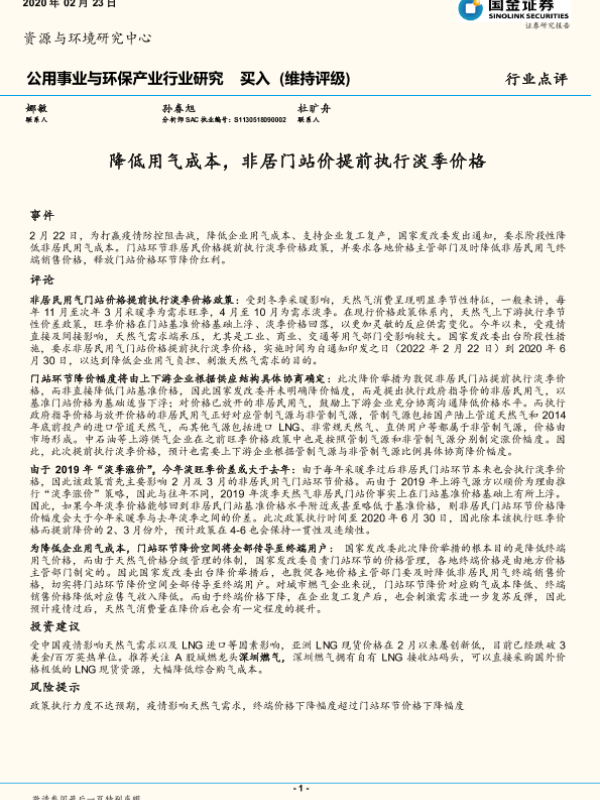 【国金证券】【20200223】降低用气成本,非居门站价提前执行淡季价格-3页 行业研究