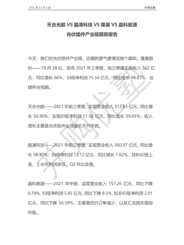 【并购优塾】【20211105】天合光能VS晶澳科技VS隆基VS晶科能源:光伏组件产业链跟踪报告-24页 行业研究