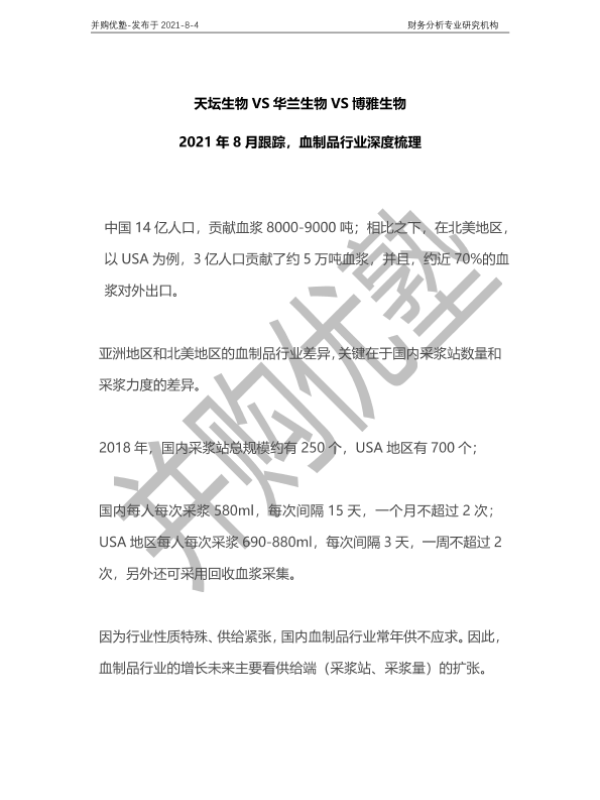 【并购优塾】【20210804】2021年8月跟踪,血制品行业深度梳理:天坛生物VS华兰生物VS博雅生物-27页 行业研究