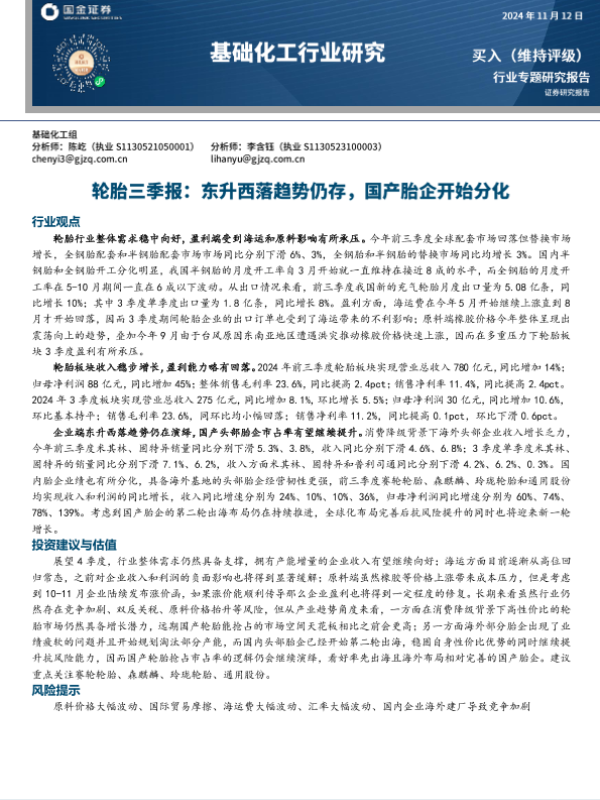 【国金证券】【20241112】基础化工行业研究:轮胎三季报:东升西落趋势仍存,国产胎企开始分化-21页 行业研究