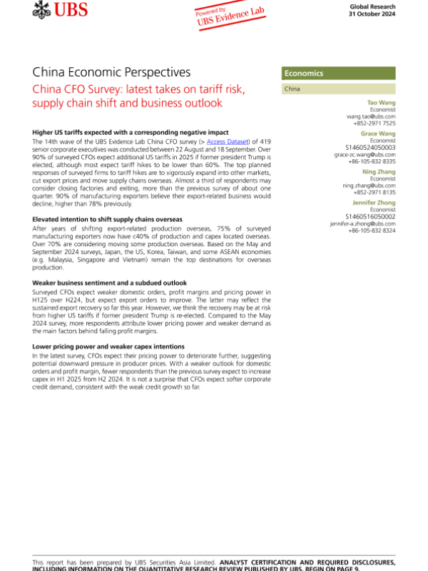 【UBS Securities Asia Limited】【20241031】China Economic Perspectives China CFO Survey latest takes on tariff risk, supply chain shift and business outlook-12页 行业研究