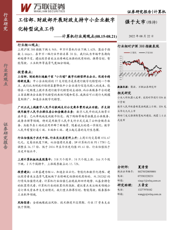 【万联证券】【20220822】20220822-万联证券-计算机行业周观点:工信部、财政部开展财政支持中小企业数字化转型试点工作-11页 行业研究