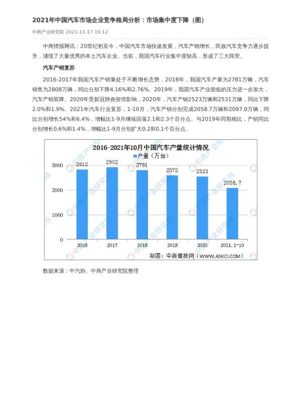 【中商产业研究院】【20211117】2021年中国汽车市场企业竞争格局分析:市场集中度下降-5页 行业研究