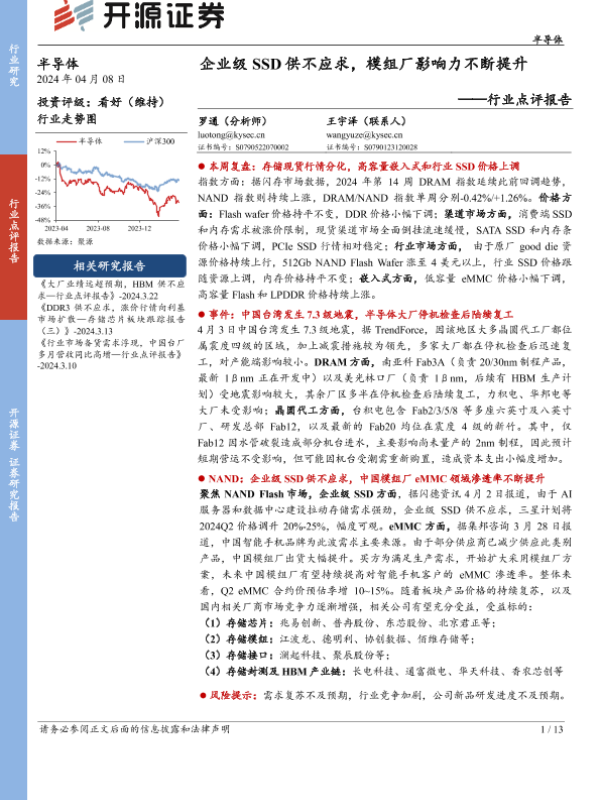 【开源证券】【20240408】半导体行业点评报告:企业级SSD供不应求,模组厂影响力不断提升-13页 行业研究