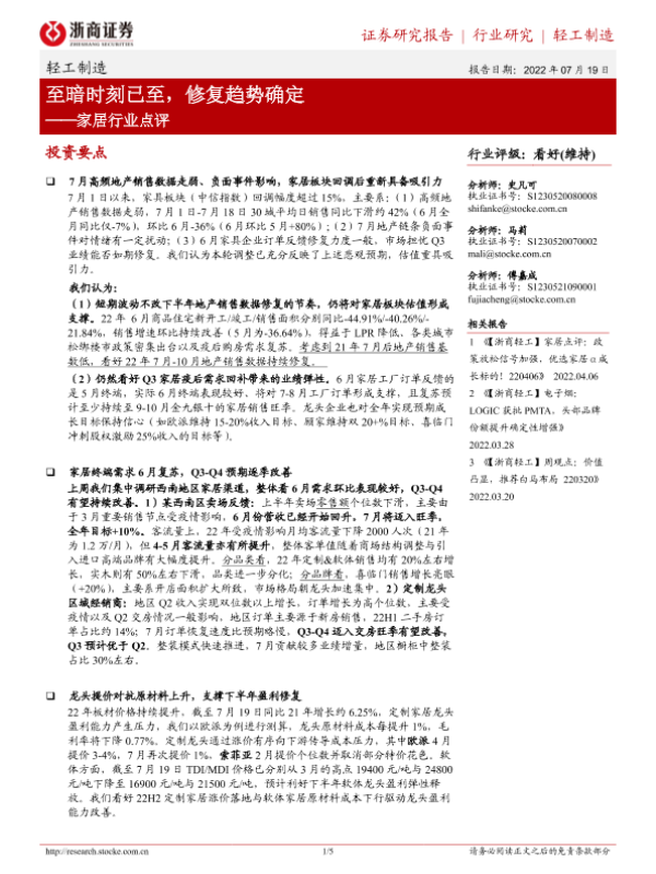 【浙商证券】【20220719】20220719-浙商证券-家居行业点评:至暗时刻已至,修复趋势确定-5页 行业研究