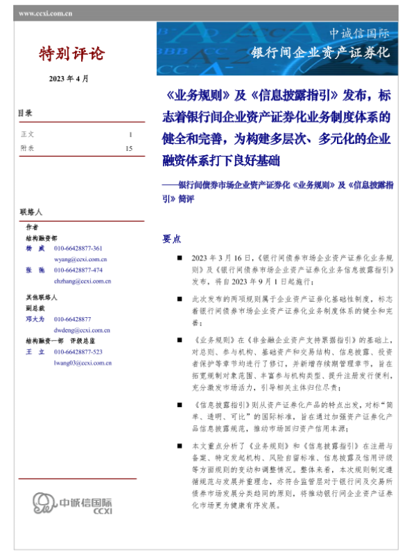 【中诚信国际】【202304】中诚信-银行间债券市场企业资产支持证券《业务规则》及《信息披露指引》简评-15页 行业研究