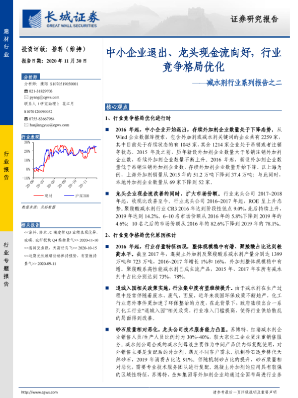 【长城证券】【20201130】减水剂行业系列报告之二:中小企业退出、龙头现金流向好,行业竞争格局优化-15页 行业研究
