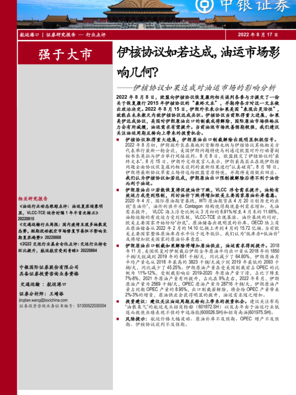 【中银证券】【20220817】伊核协议如果达成对油运市场的影响分析-4页 行业研究