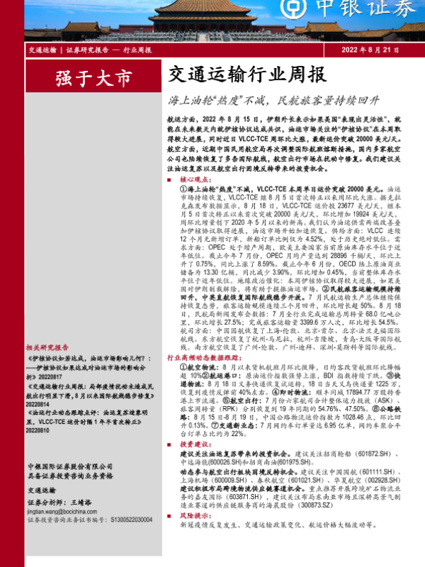 【中银证券】【20220821】交通运输行业周报:海上油轮“热度”不减,民航旅客量持续回升-28页 行业研究